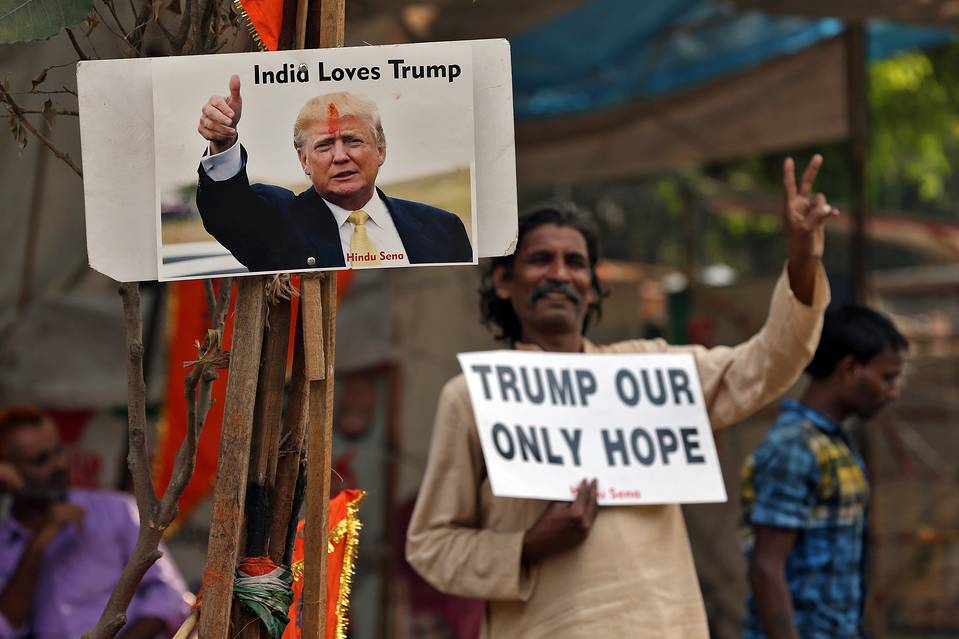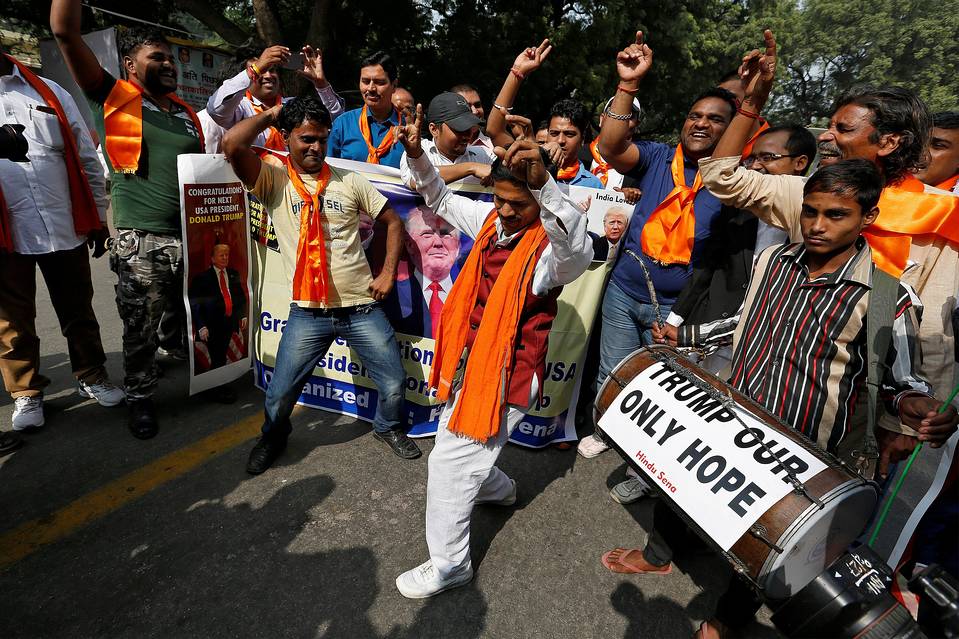 A member of Hindu Sena celebrated Mr. Trump’s victory, in New Delhi, India, Nov. 9, 2016. PHOTO: CATHAL MCNAUGHTON/REUTERS