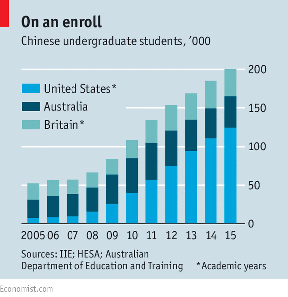 In the 1870s the Qing imperial court ended centuries of educational isolation by sending young men to America, only for the Communist regime to shut out the world again a few decades later. Today record numbers of Chinese study abroad: over half a million people left in 2015 alone, many for America (see chart).