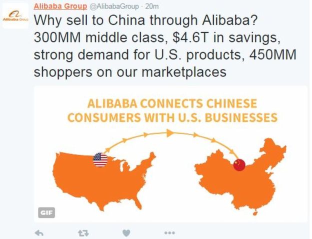 Mr Ma, who is one of the richest people in China, specifically said that farmers and small clothing makers in the US Midwest should use the Alibaba online marketplace to reach Chinese consumers.