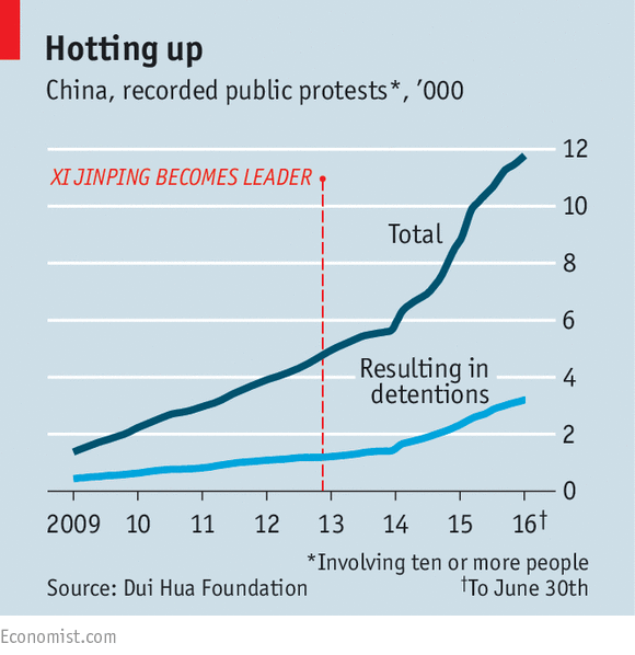 Perhaps because they are often poorly run, hotlines do not seem to be making local governments any more popular. These form the most despised tier of authority in China: many of the most egregious face-to-face abuses of power take place locally. In Jinan, despite all those efficiency gains, the survey found that “enquirer satisfaction” was only 1.3% higher after the hotline was established than before it. The spread of hotlines has had no discernible impact on the rise of anti-government demonstrations, most of which are aimed at local governments (see chart).