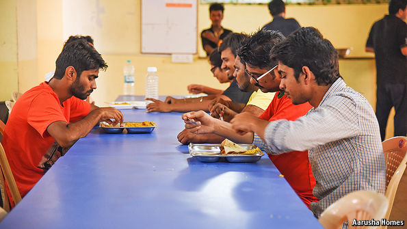 India has two main drags on economic growth. One is the difficulty of finding a job, especially in the places people live. The other is a chronic shortage of cheap housing. Aarusha Homes, Mr Aher’s employer, started in 2007 to help people seize economic opportunities far from home. Its rooms are basic and cheap. They include up to six beds, a bathroom for every three or four residents, some common areas and little else. Rent ranges between 3,500 and 10,000 rupees ($52-$149) a month including food.