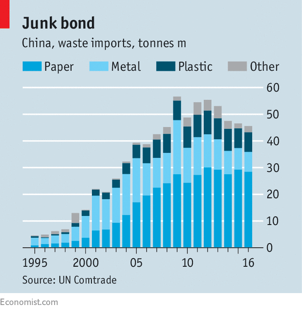 Imports of rubbish have helped feed China’s voracious appetite for raw materials. It is often cheaper to recycle scrap copper, iron and steel, as well as waste paper and plastic, than to make such materials from scratch, especially when commodity prices are high. So as commodity prices rose during the 2000s, the burgeoning trade in waste benefited both exporters, who made money from previously worthless trash, and importers, who gained access to a reliable stream of precious feedstock. Between 1995 and 2016 Chinese imports of waste grew tenfold, from 4.5m to 45m tonnes.