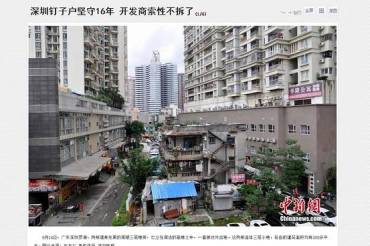 Resistance by homeowners to development usually draws sympathy from ordinary Chinese, who often complain that local governments in their zeal for growth and revenues favor developers and ignore property rights. Holdouts like the Shenzhen building have become popular symbols of resistance, known as “nail houses” because they stick out like nails from a flat surface, such as a razed construction site for example.