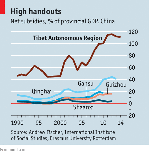 Karma chameleonBut work can be difficult to get, despite years of huge government aid that has helped to boost growth. Government subsidies for the TAR amounted to 111% of GDP in 2014 (see chart), according to Andrew Fischer of Erasmus University Rotterdam. Eleven airports serve Qinghai and the TAR—they will have three more by 2020. A 156-mile train line from Lhasa (population 560,000) to Shigatse (population 120,000), which was completed in 2014, cost 13.3 billion yuan ($2.16 billion). A second track to Lhasa is being laid from Sichuan, priced at 105 billion yuan.