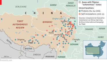 AN ELDERLY woman with long, grey plaits, wearing a traditional Tibetan apron of wool in colourful stripes, has spent her day weaving thread outside her home near the southern end of Qinghai Lake, high on the Tibetan plateau. She is among hundreds of thousands of Tibetan nomads who have been forced by the government in recent years to settle in newly built villages. She now lives in one of them with her extended family and two goats. Every few months one of her sons, a red-robed monk, visits from his monastery, a place so cut off from the world that he has never heard of Donald Trump. Her grandson, a 23-year-old with slick hair and a turquoise rain jacket, is more clued in. He is training to be a motorcycle mechanic in a nearby town. Theirs is a disorienting world of social transformation, sometimes resented, sometimes welcome.Chinese and foreigners alike have long been fascinated by Tibet, romanticising its impoverished vastness as a haven of spirituality and tranquillity. Its brand of Buddhism is alluring to many Chinese—even, it is rumoured, to Peng Liyuan, the wife of China’s president, Xi Jinping. Many Tibetans, however, see their world differently. It has been shattered by China’s campaign to crush separatism and eradicate support for the Dalai Lama, their spiritual leader who fled to India after an uprising in 1959. The economic transformation of the rest of China and its cities’ brash modernity are seductive, but frustratingly elusive.