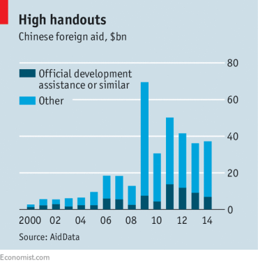 The most detailed study so far of Chinese aid, published this week by AidData, a research group at the College of William and Mary in Virginia, shines a light on the murky data. The report looks at 4,400 projects which China has either committed to, is building or has finished, between 2000 and 2014. It finds that the country gave or lent about $350bn over that period—not much less than the total of American aid, which was $424bn in those years. But almost all of America’s aid is in the form of grants, compared with a fifth of China’s. The rest is concessional lending at below-market interest rates, mostly to Chinese companies working abroad—the kind of aid that used to be common in the West but went out of fashion in the 1990s because it overburdened recipients with debt. The grant component of China’s aid was $75bn, still a lot (about the same as Britain’s), but not a tidal wave of money.